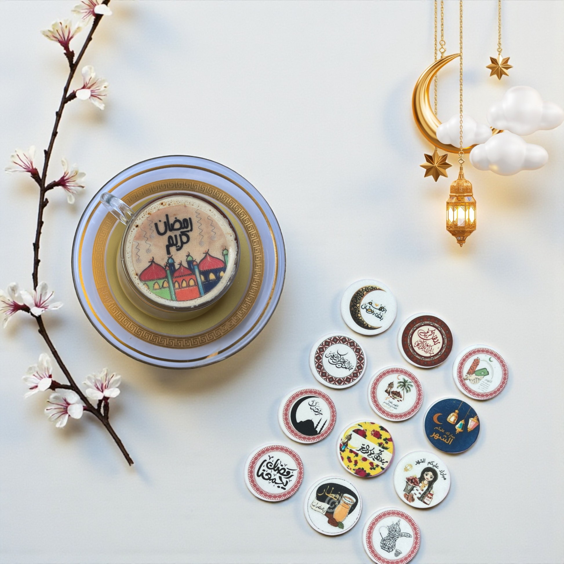 • ورق سكر صالح للأكل لتزيين المشروبات – طباعة رمضان – 12 قطعة (5 سم)