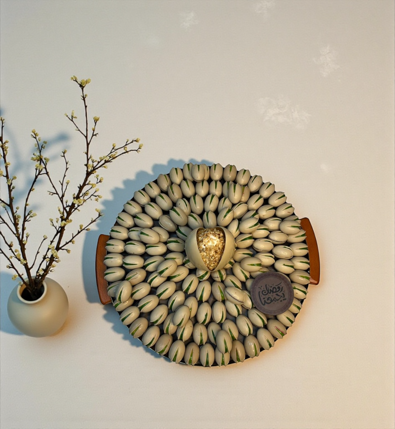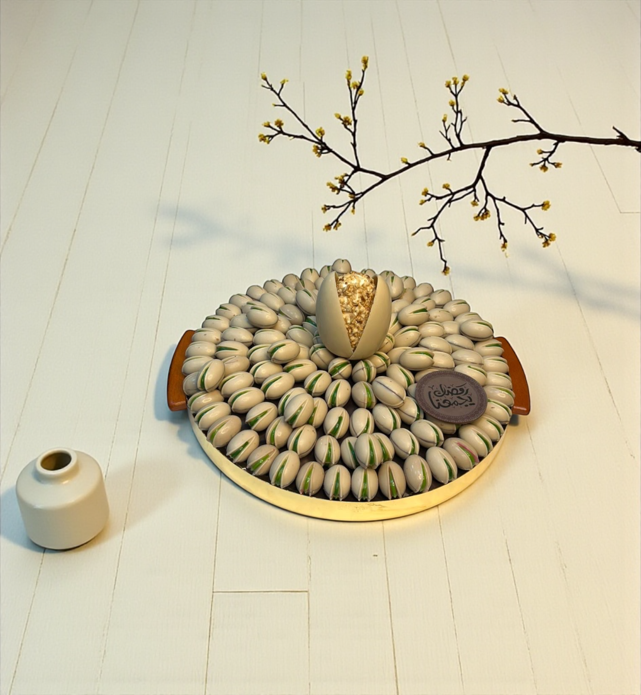 Luxury Stainless Steel Platter — Pistachio Praline, Kunafa & Grand Chocolate Egg صحن ستانلس ستيل فاخر — حبة الفستق والكنافة وبيضة الشوكليت الملكية